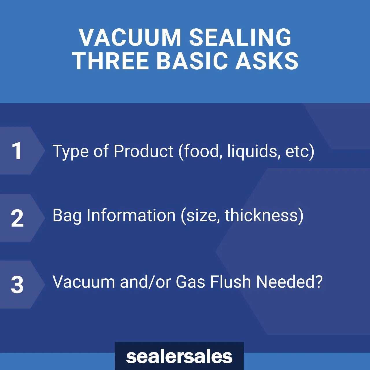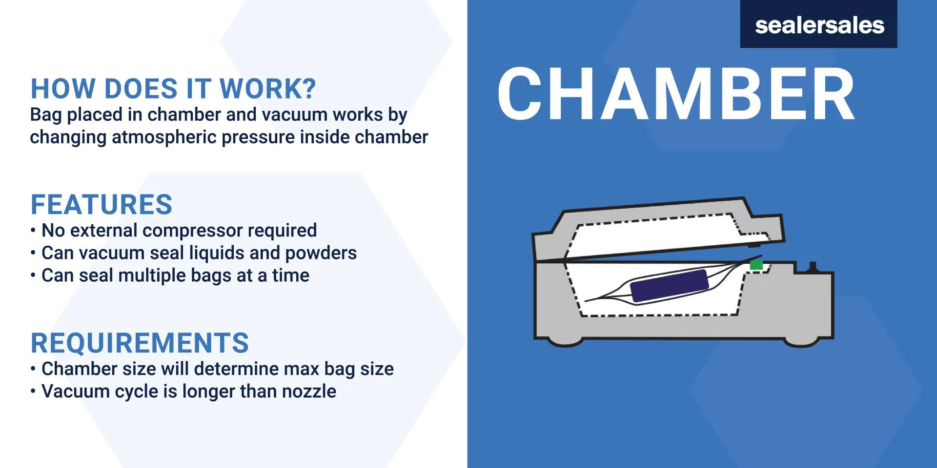 In a chamber vacuum sealer, bags are placed in a chamber to initiate the vacuum sealing operation by changing the atmospheric pressure inside the chamber. Chambers can vacuum seal almost any product include liquids and powders. Chambers do not need an external compressor to operate. For a more in-depth explanation on chambers, click here.